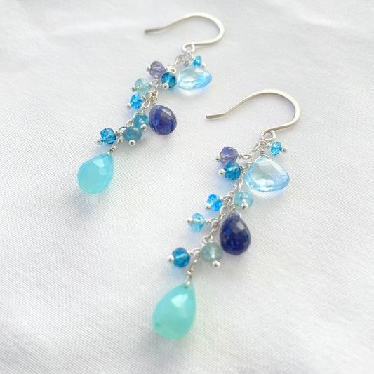 Aquamarine Iolite Chalcedony Cluster Earrings. Long Cluster Faceted Blue Gemstone Earrings.