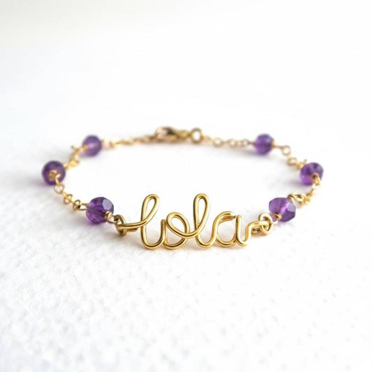 14k Gold Name Bracelet: Lowercase Script, Gemstone and Chain