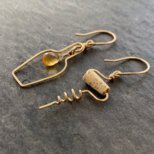 14k Gold Wine Earrings: Champagne Bottle, Corkscrew, Citrine