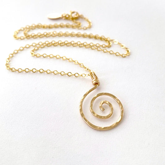 14k Gold Spiral Pendant Necklace: Hand Hammered Round Swirl.