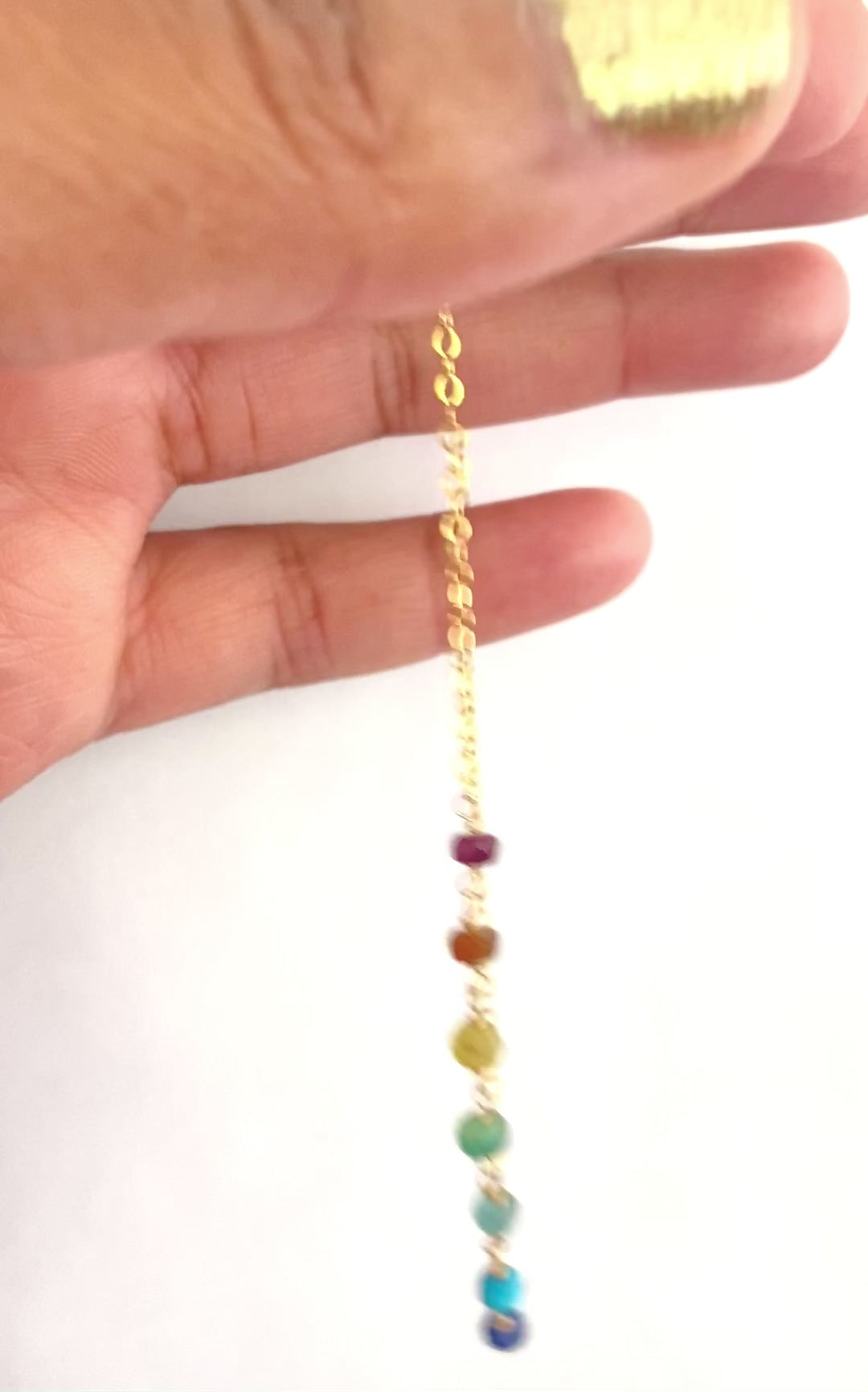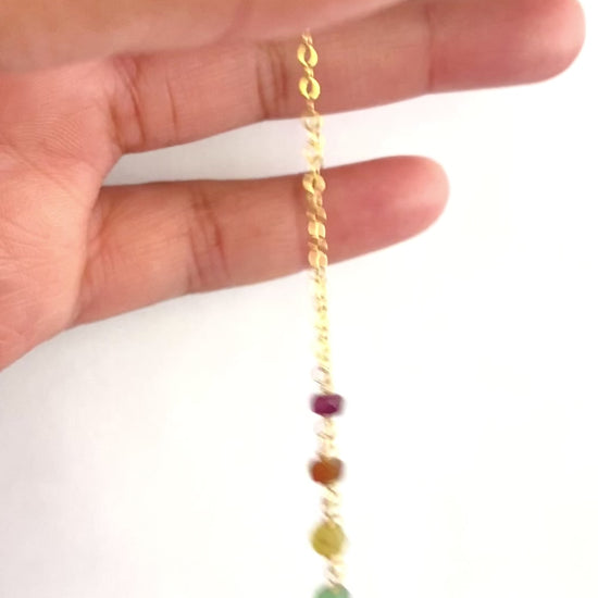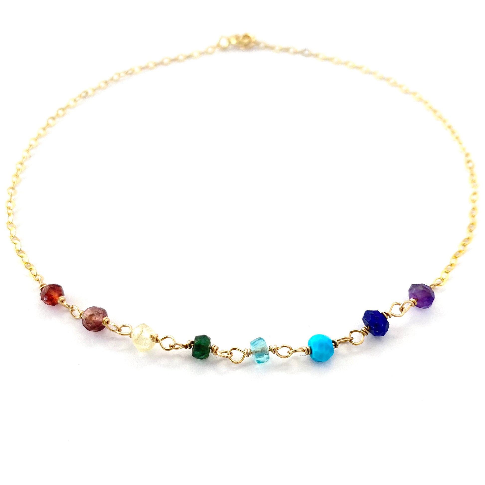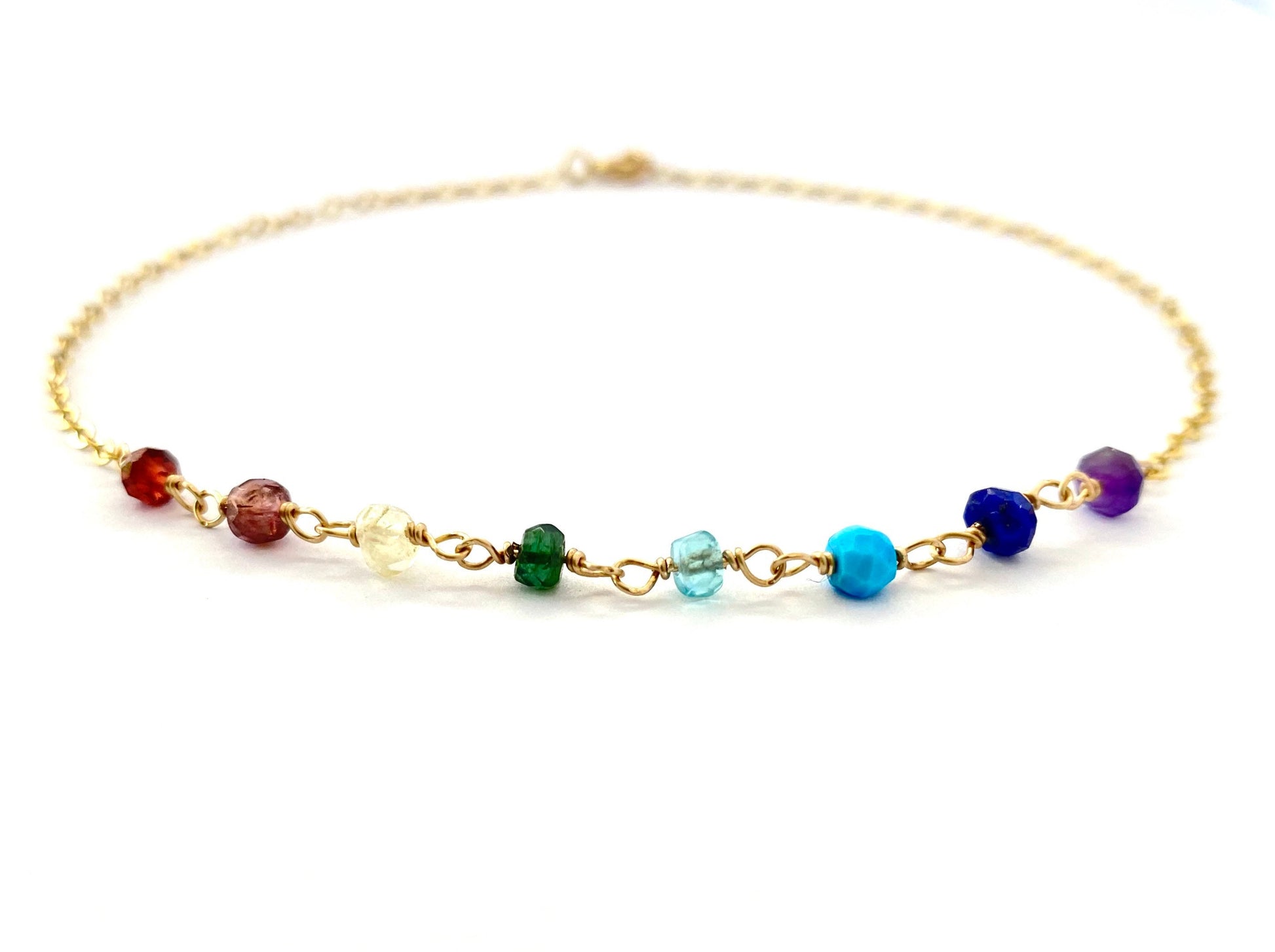 Made from small 3-4mm gemstones in all shades of the rainbow, this anklet is paired with delicate, feminine 14k gold filled wire and chain.