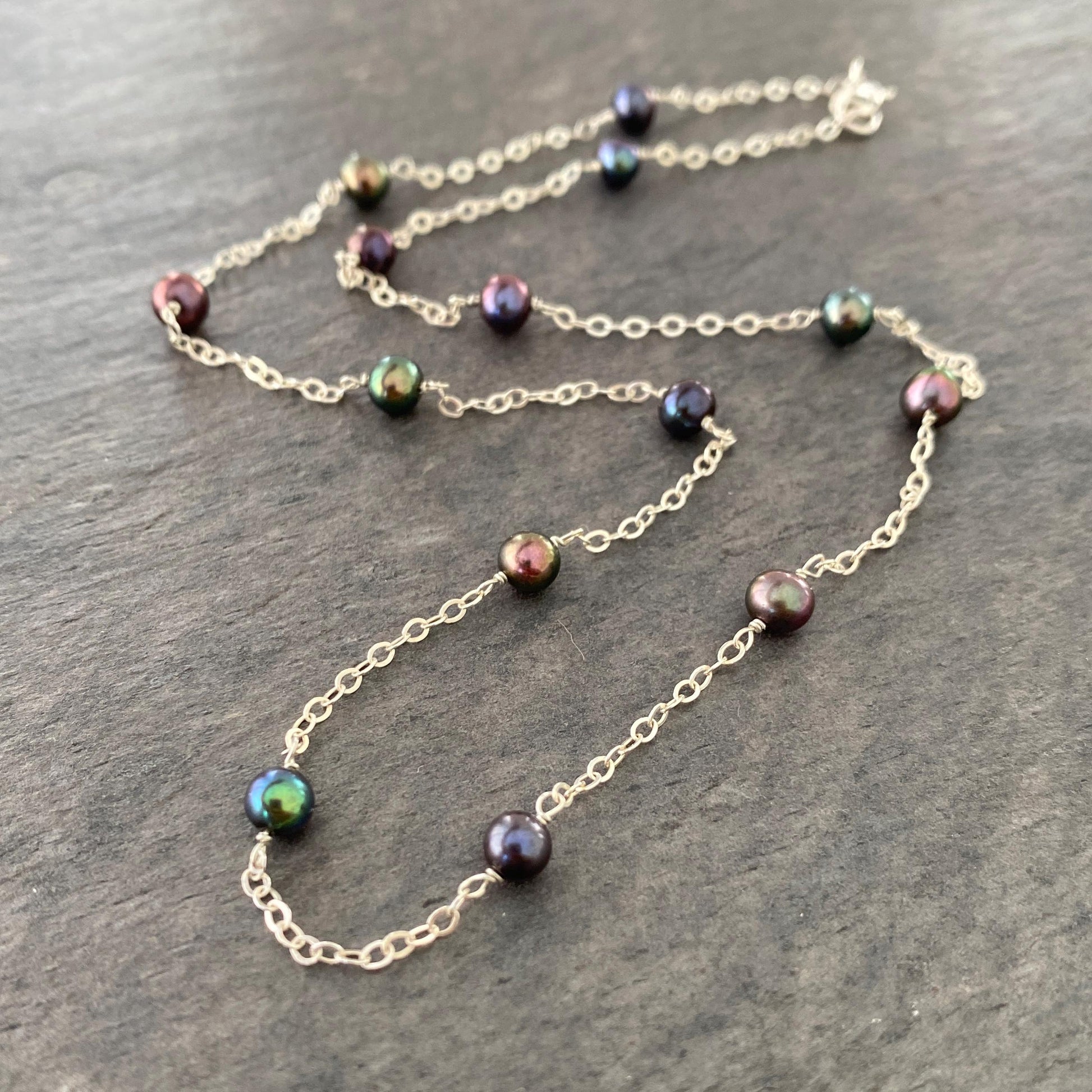 A shimmering strand of tiny 4–5mm luminous black peacock freshwater pearls, each one naturally iridescent with hints of green, blue, grey, and purple. This elegant necklace is custom made with your choice of sterling silver, 14k gold filled wire and shiny chain.