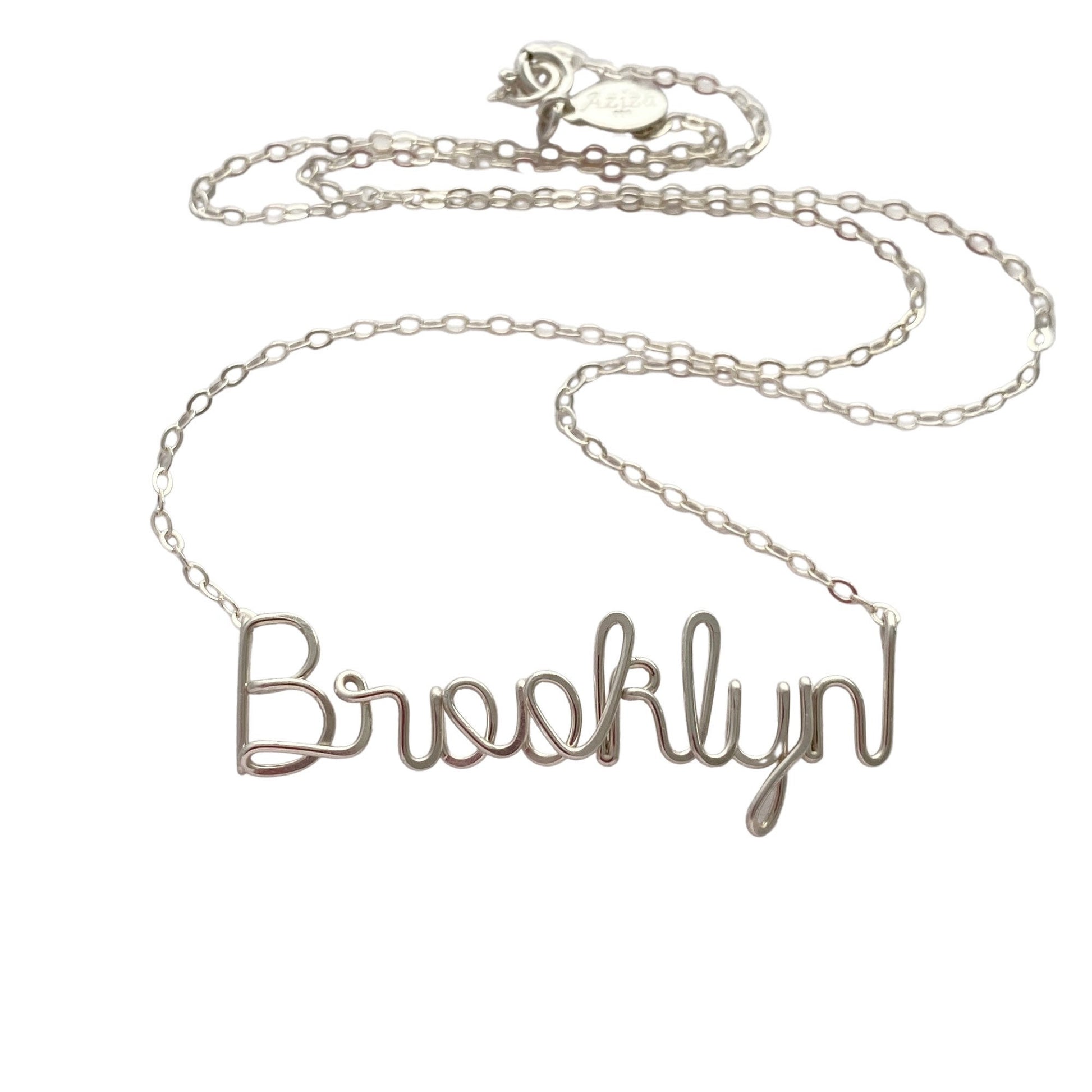 The Brooklyn necklace is hand formed with sterling silver wire and comes standard on a delicate feminine sterling silver chain. The width of the word measures about 1 1/2 inches. The length you select will include the wire and chain.