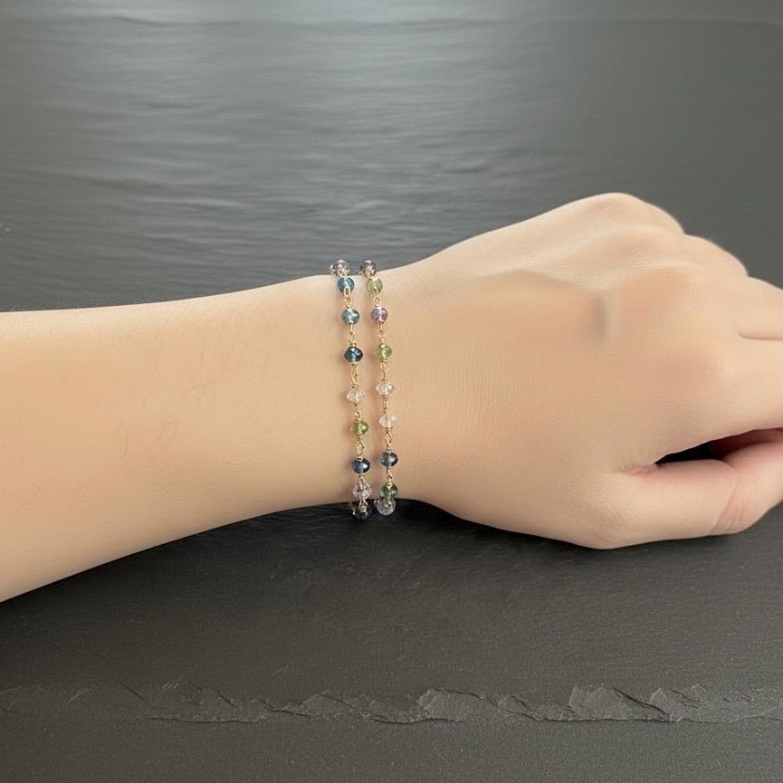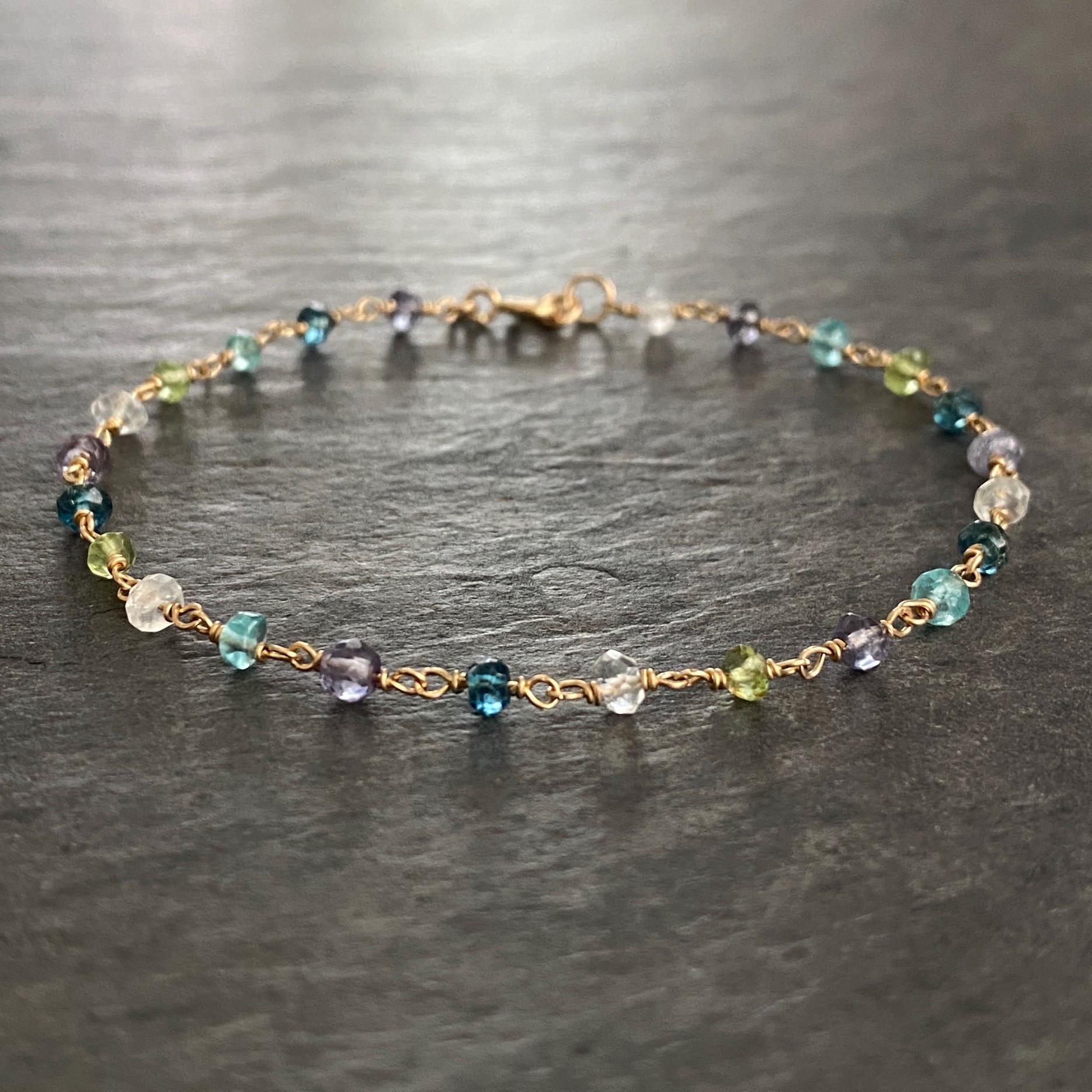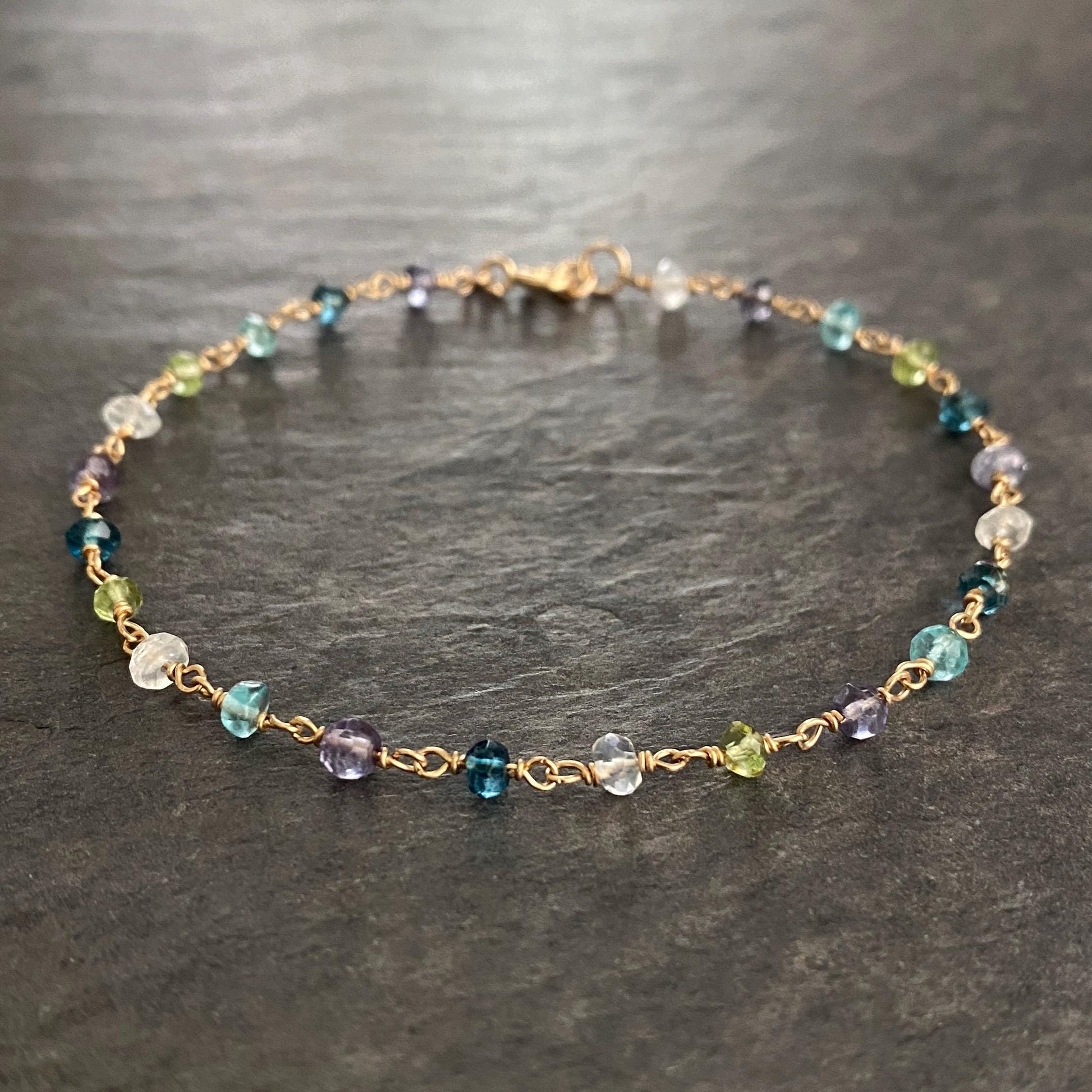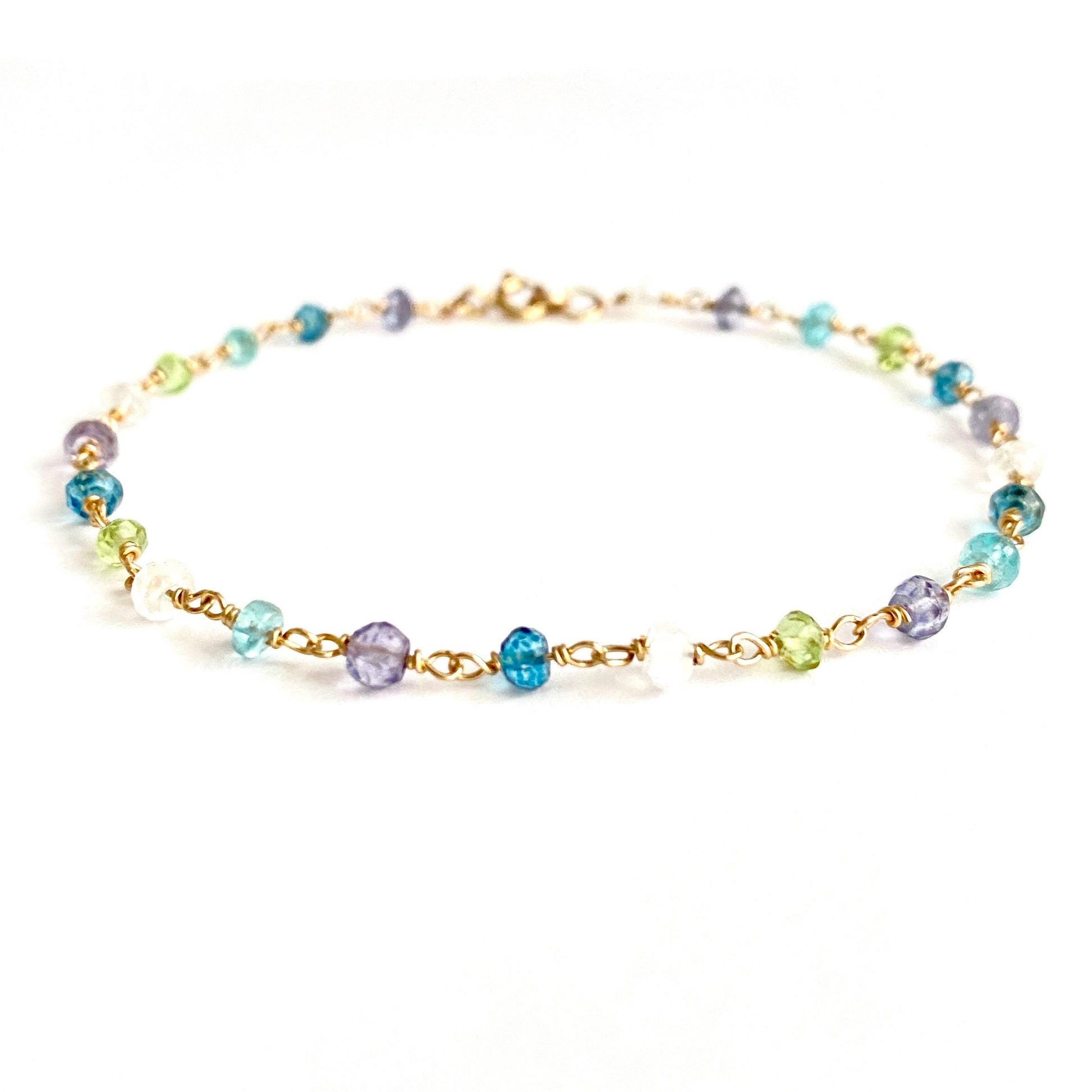 A delicate, heirloom-quality gemstone station bracelet featuring five natural gemstones: Iolite, Topaz, Peridot, Aquamarine, and Rainbow Moonstone; each wrapped by hand in luminous 14k gold filled wire. Every stone sparkles with soft ocean-to-sky color, creating a bracelet that feels both ethereal and timeless.
