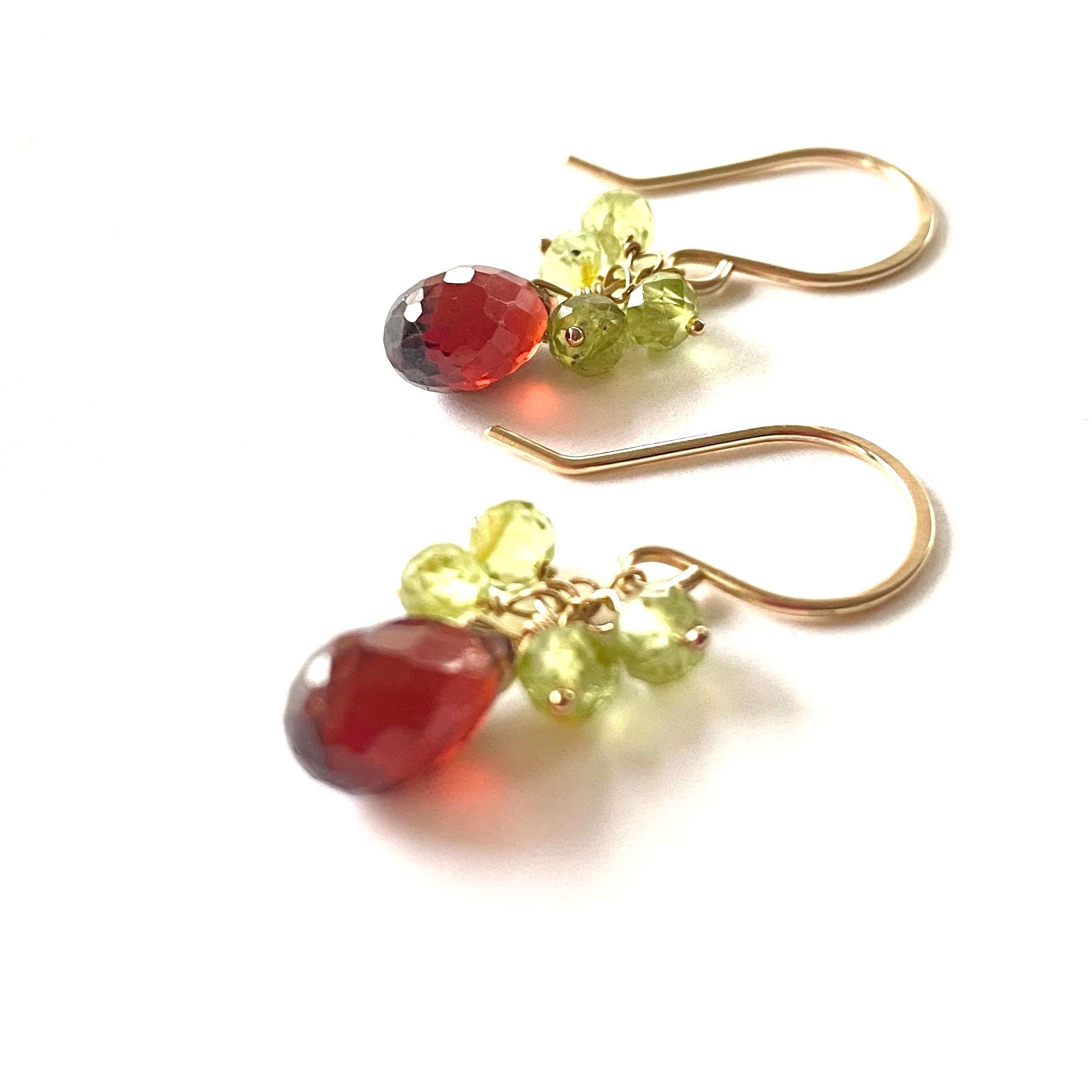 These one-of-a-kind garnet and peridot earrings are a study in contrast, deep, wine-red garnet paired with softly luminous peridot for a look that feels both earthy and refined. The faceted gemstones catch the light with every movement, creating subtle sparkle without overpowering the natural beauty of the stones.
