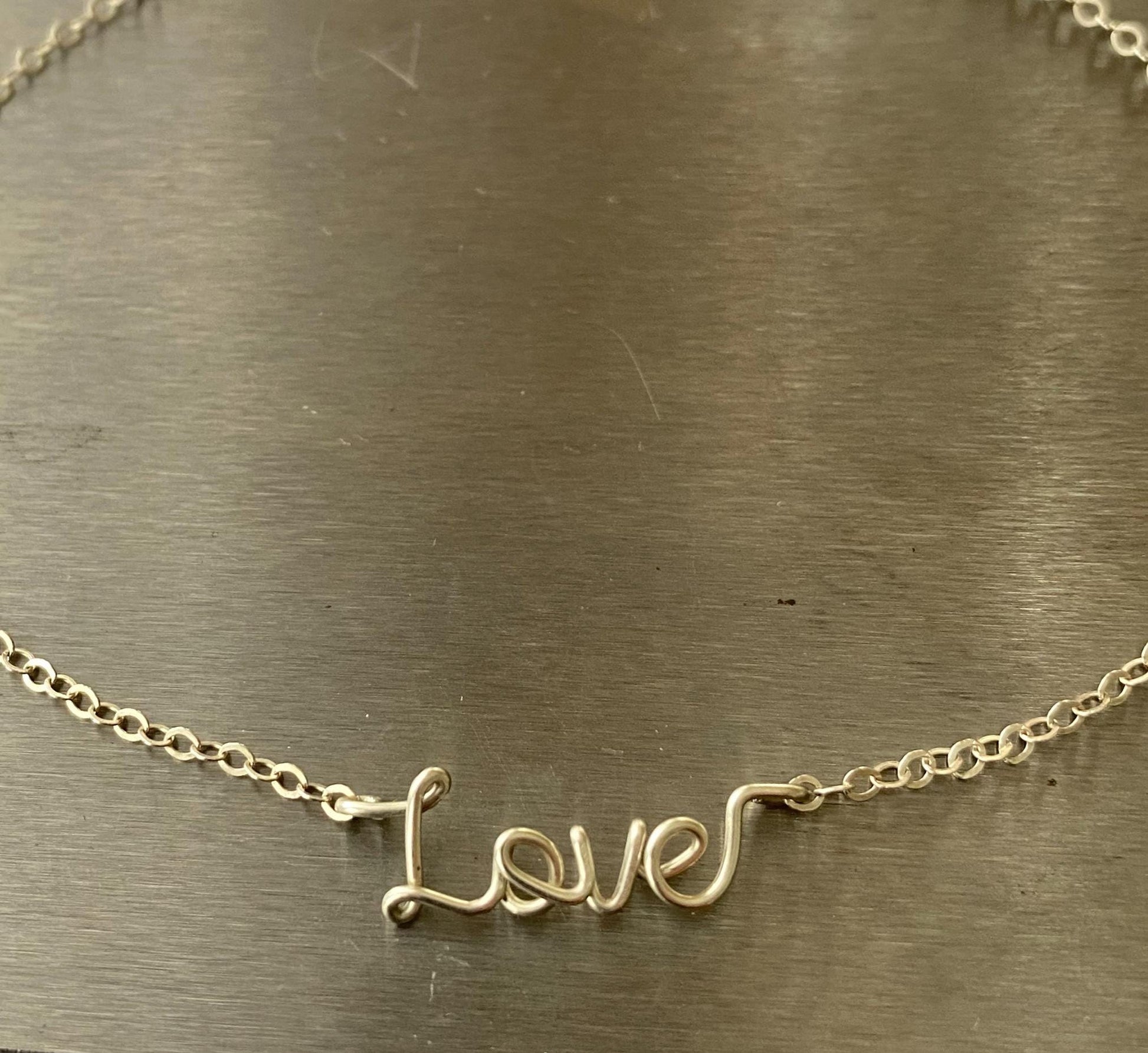 This dainty “love” anklet is handcrafted in nickel-free 14k white gold, designed to sit softly at the ankle with an effortless, feminine presence. The delicate script is hand-formed and lightly hammered, giving the word a subtle shimmer and organic texture that catches the light as you move.