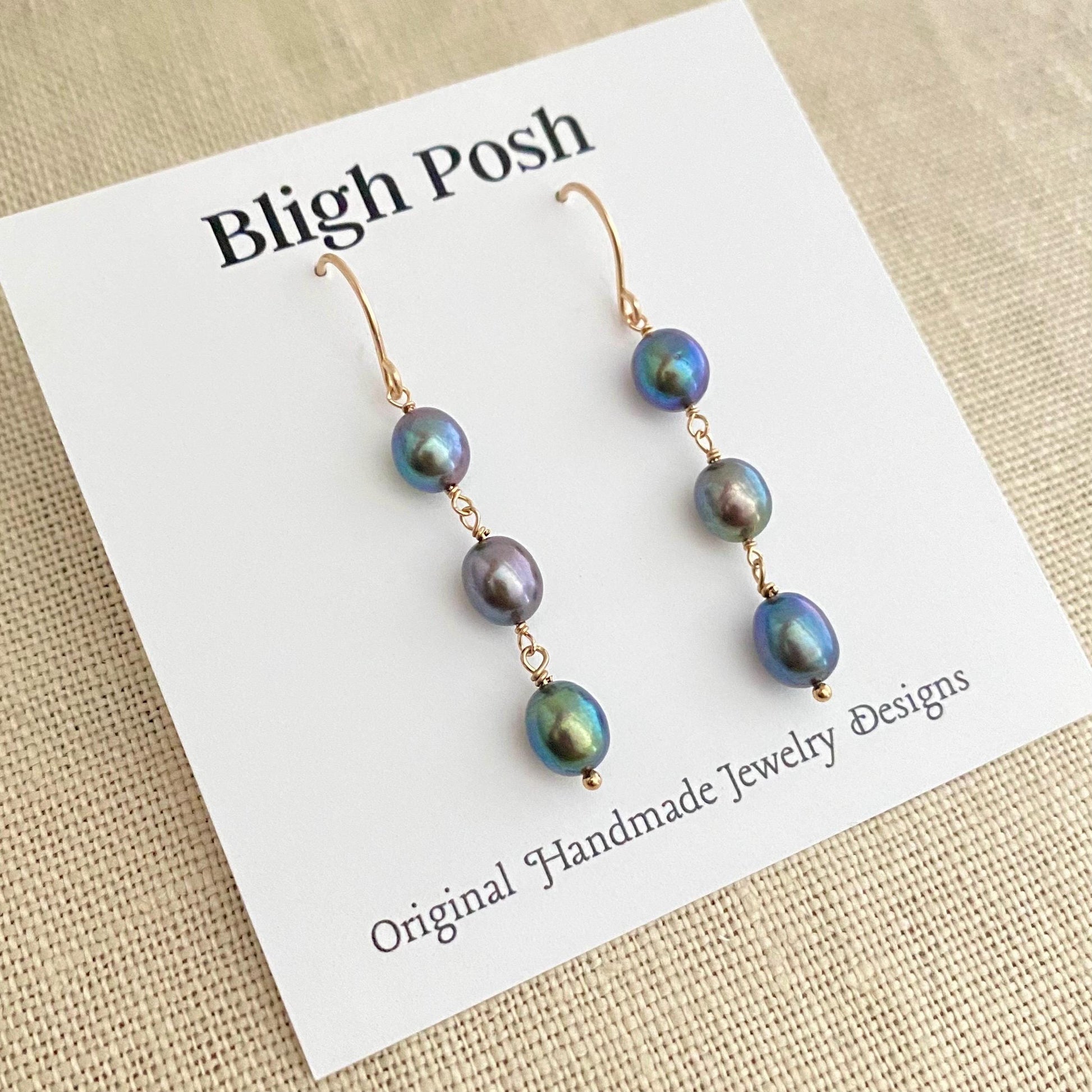 These luminous peacock pearl earrings feature three lustrous freshwater pearls on each drop, hand-selected for their rich, shifting hues of green, blue, grey, black, and violet. Each pearl reflects light beautifully, revealing a unique spectrum of color that changes as you move.