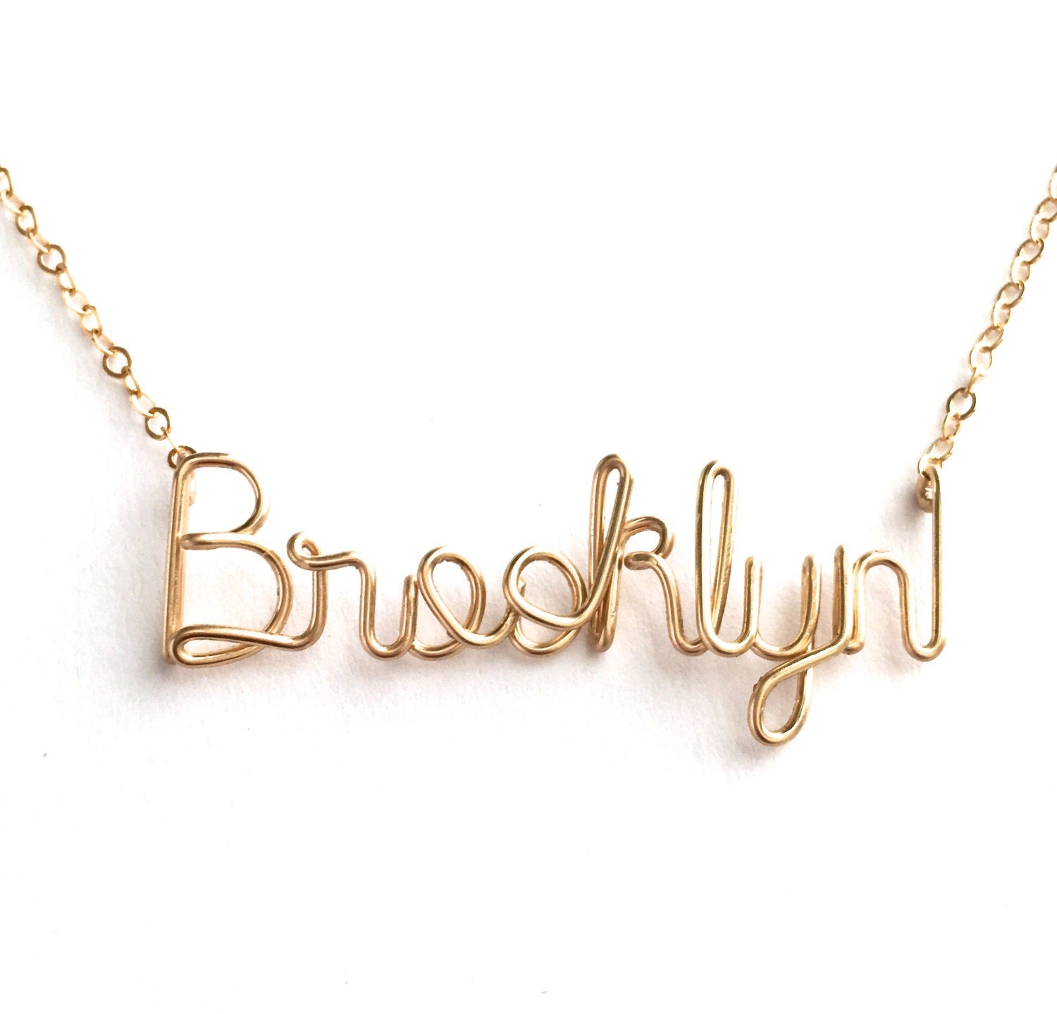 This is a hand forged custom designed name in cursive script crafted from 14k gold filled wire and delicate feminine chain, made just for you. The wire word and chain are included in the total length you select.