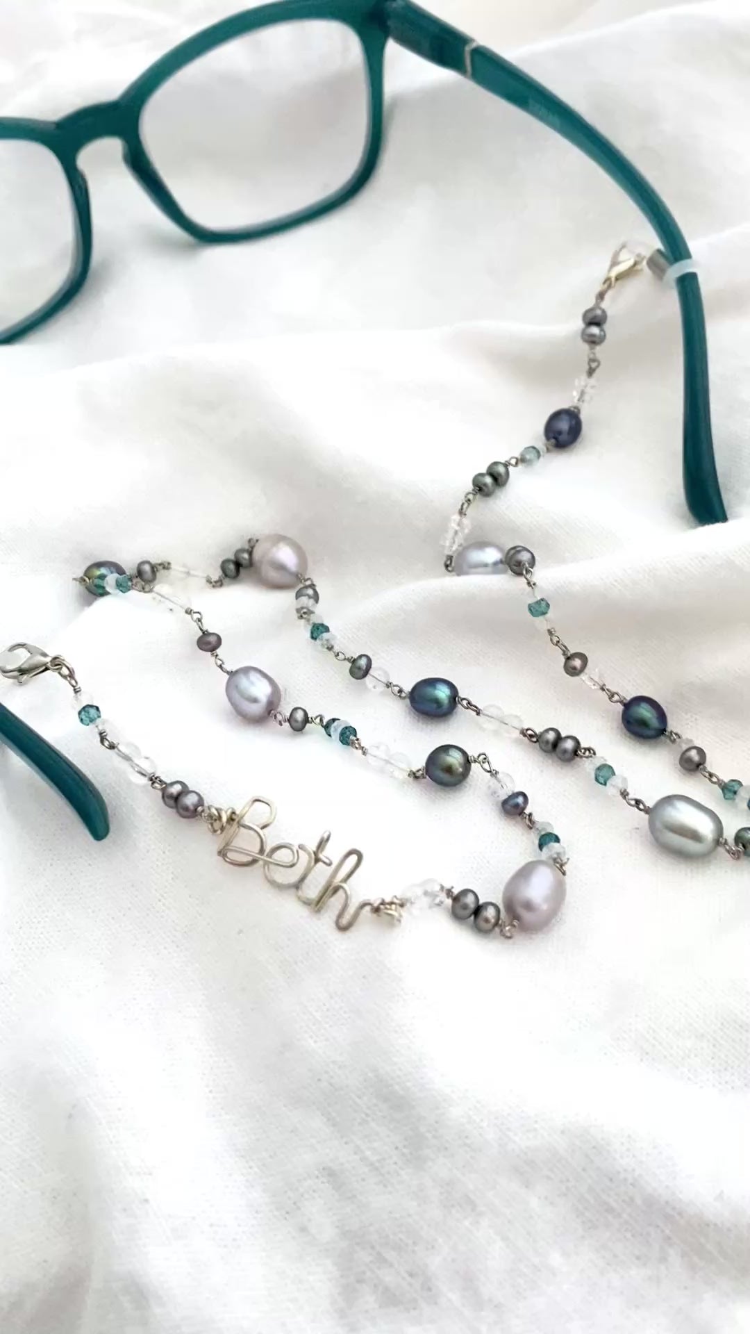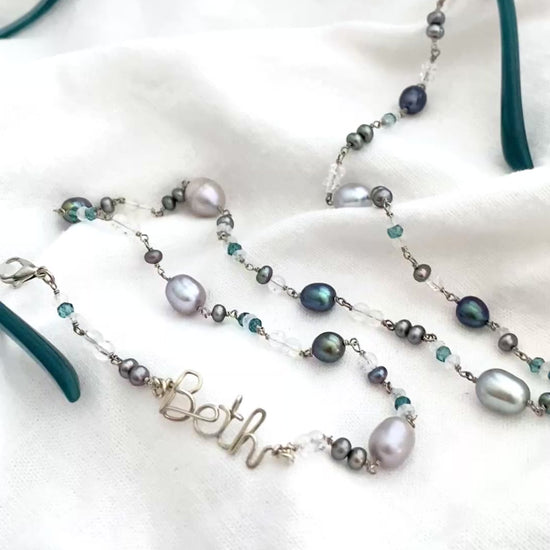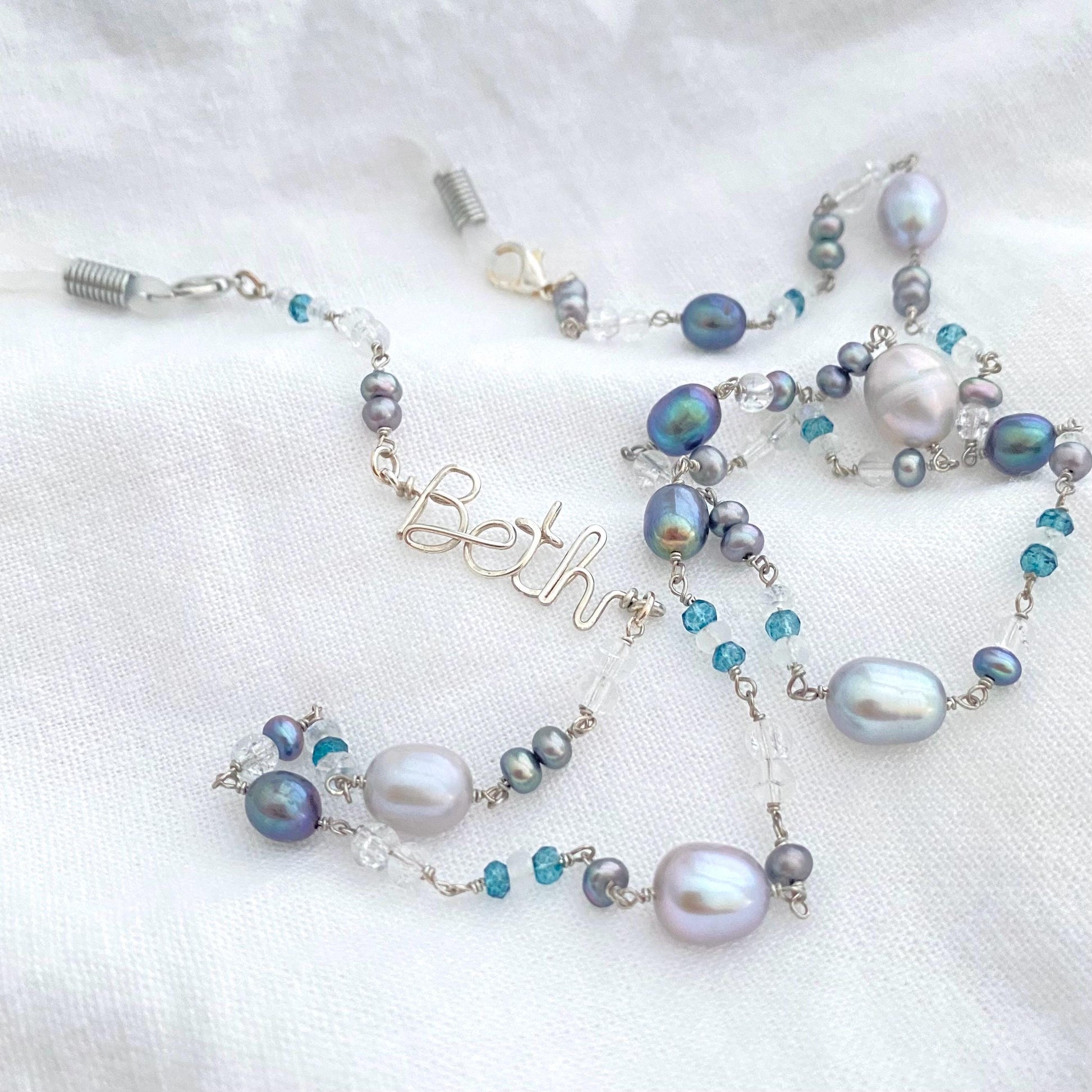 Personalized Beaded Chain Eye glasses Holder: Freshwater Pearls, Quartz, Sterling Silver