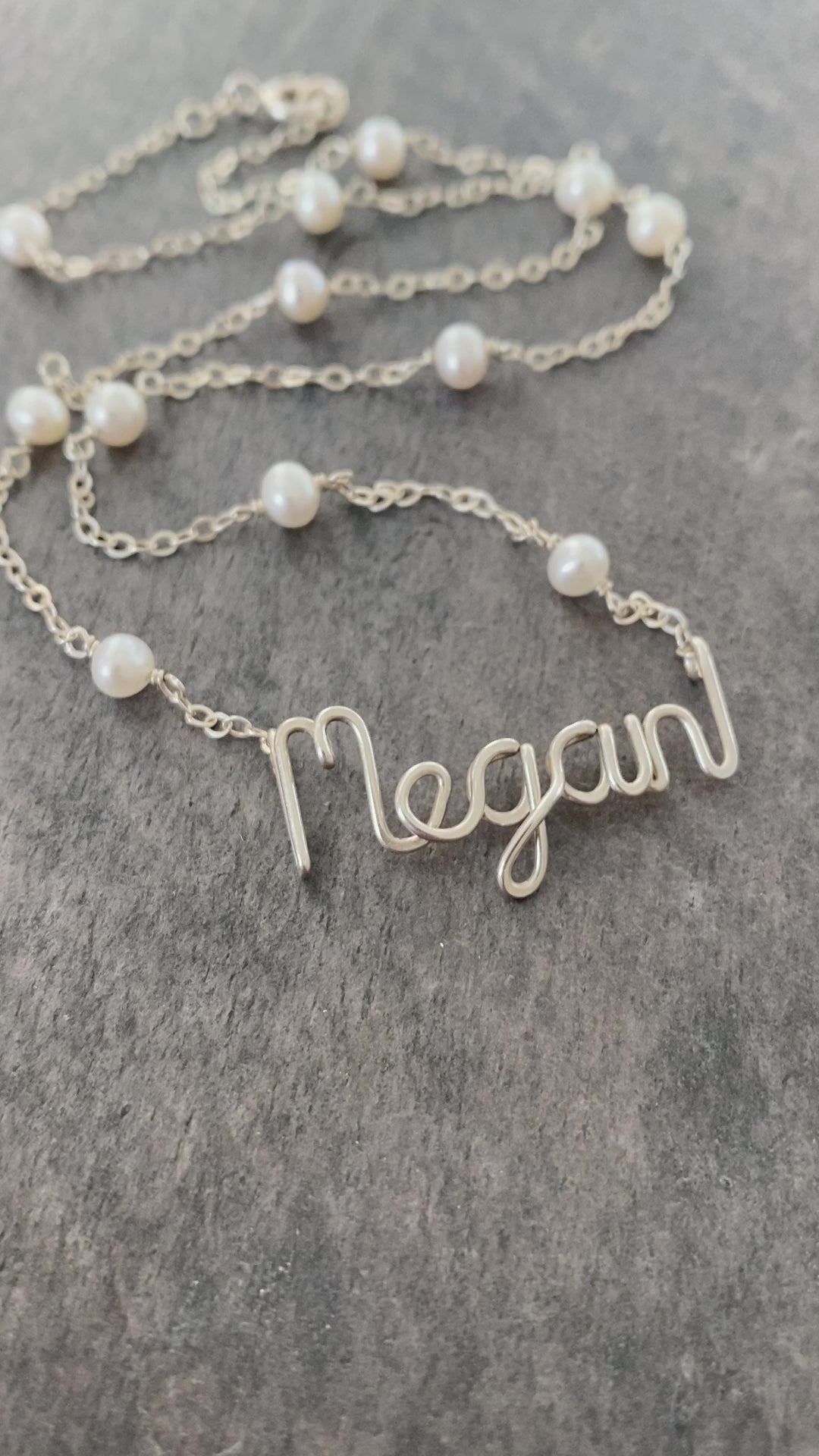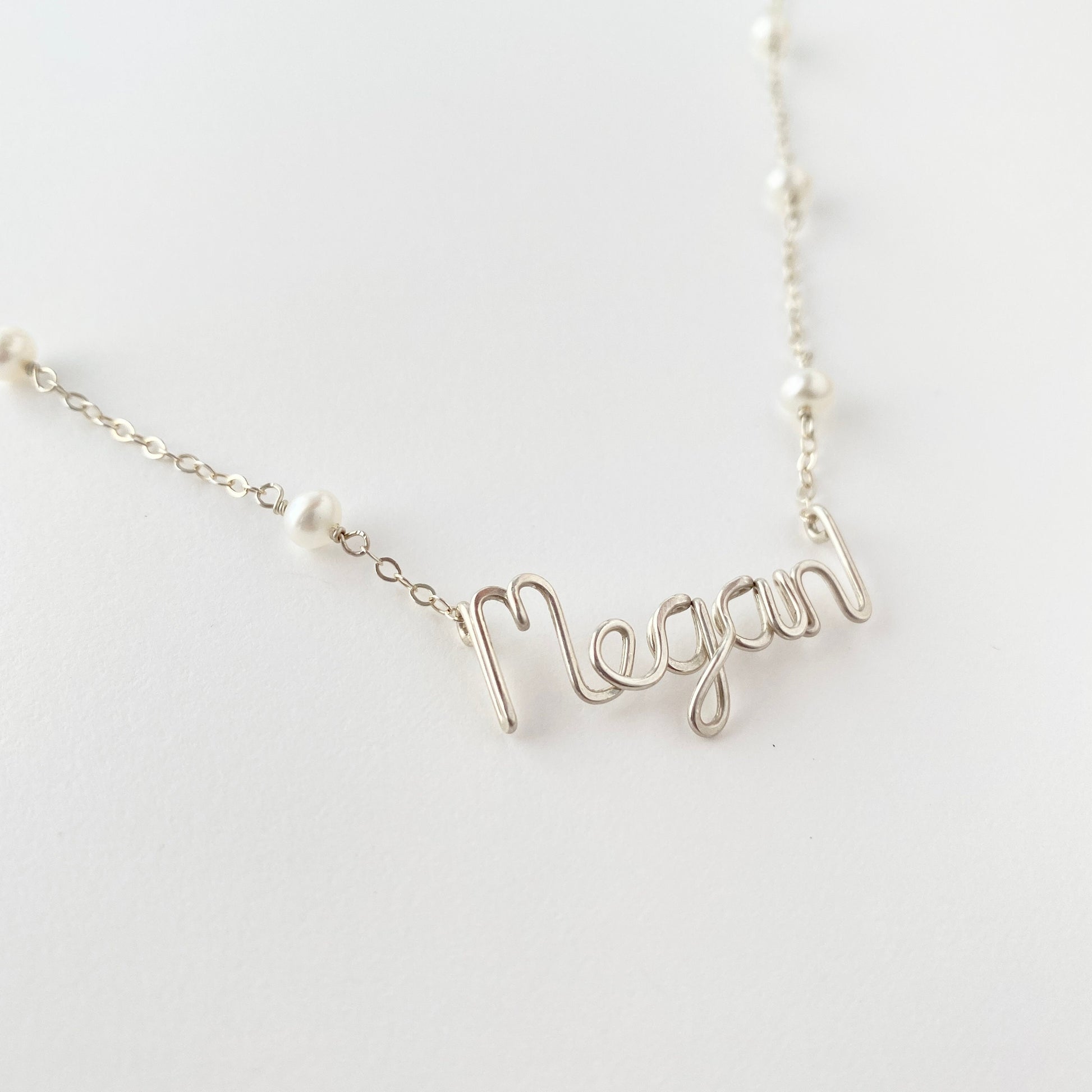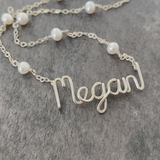 Custom name necklace with small 4-5mm off white freshwater pearls.