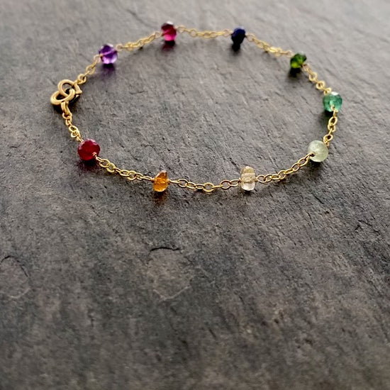 Genuine faceted gemstones in shades of the rainbow are strung together with 14k gold filled wire to form this one of a kind unique bracelet.