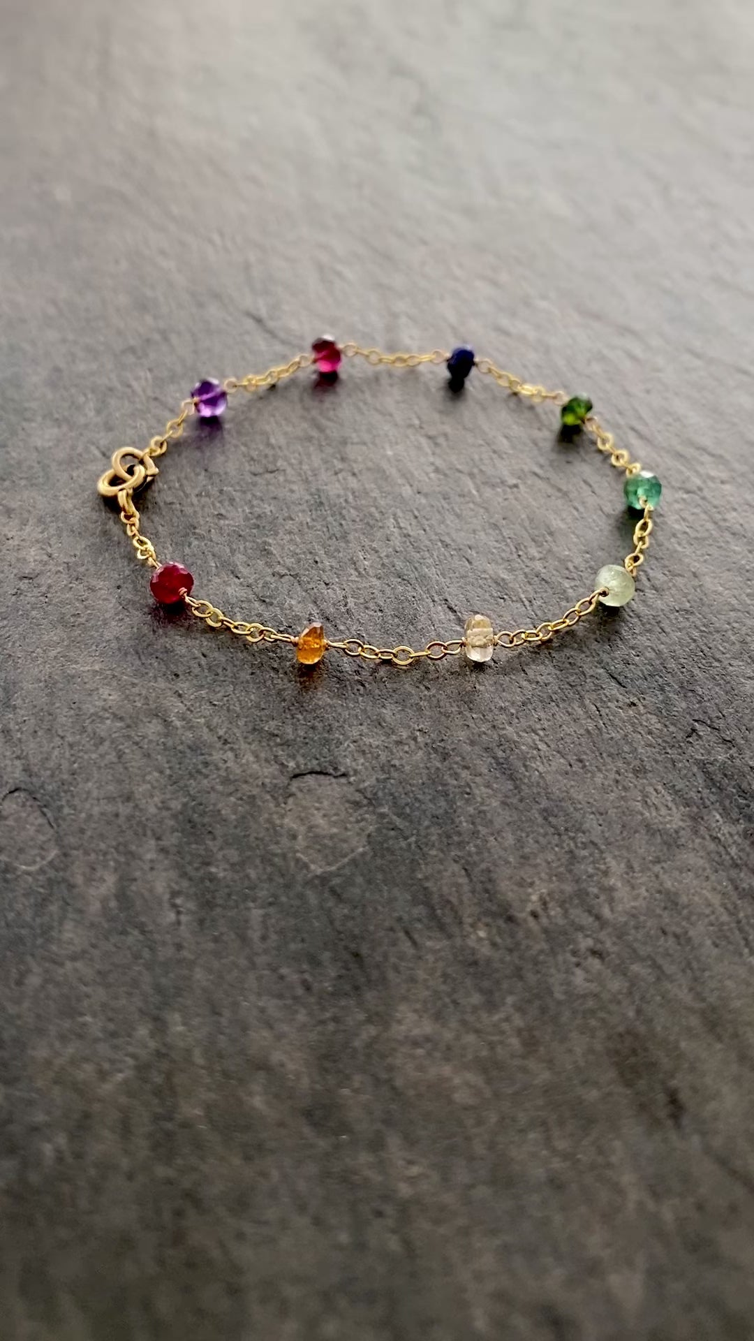 Gemstones used will vary slightly per bracelet but in this one you can see ruby, tourmaline, citrine, turquoise, lapis lazuli and amethyst.