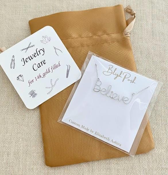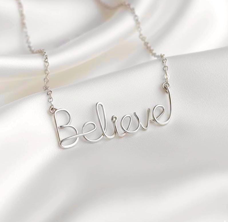 Sterling Silver Believe Necklace. Made from one piece of Sterling Silver wire and delicate feminine Sterling Silver chain. The word Believe measures about 1.5 inches wide.