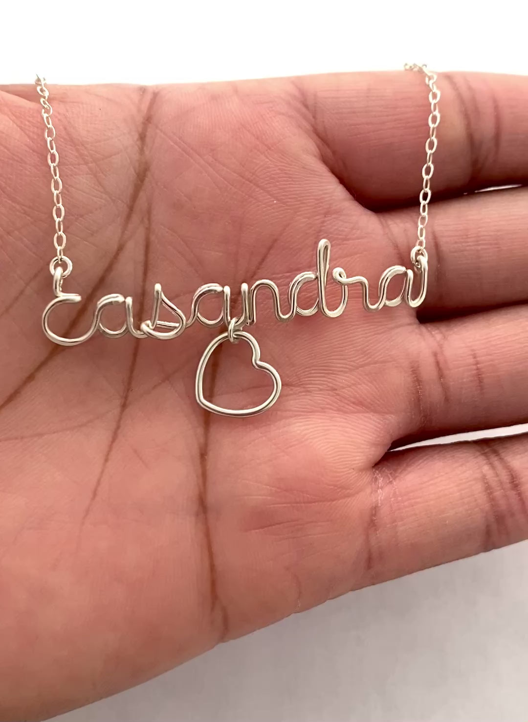 Celebrate love in its softest, purest form with this handcrafted all lowercase sterling silver name necklace, complete with a delicate heart charm that hangs from the center letter (or the closest to it). Each letter is shaped, hand-hammered, and polished in sterling silver for a luminous, organic shine that feels both modern and timeless.