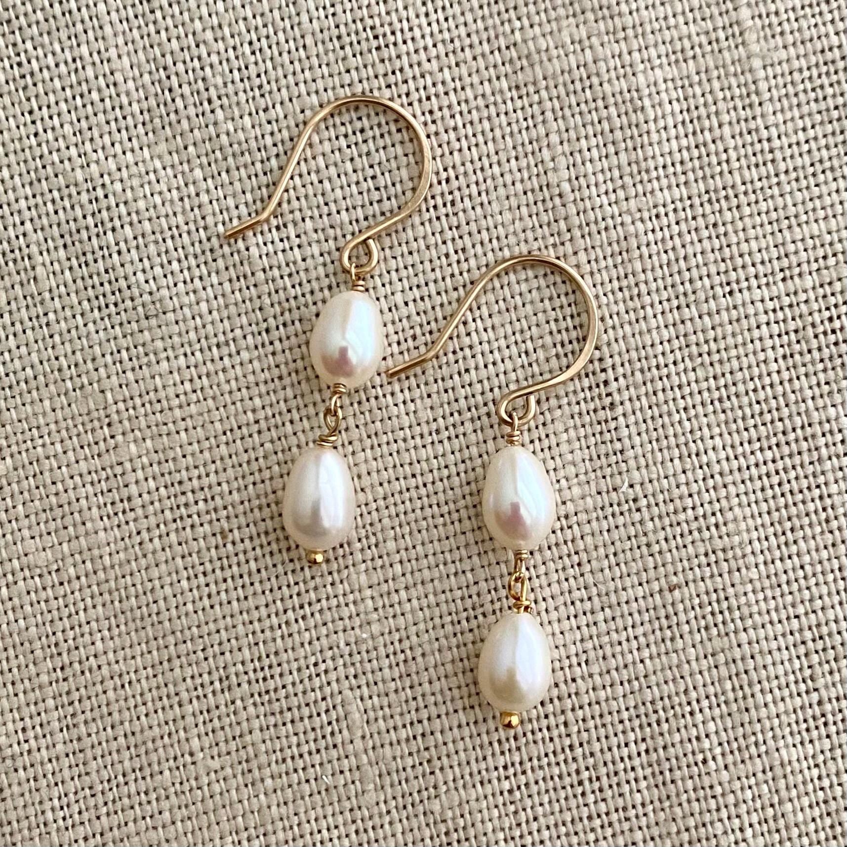 Timeless, luminous, and effortlessly elegant. These freshwater pearl drop earrings are handcrafted with 14k gold filled ear wires and components, featuring two natural pearls stacked in a graceful silhouette. Each ear wire is hand-hammered for subtle texture and added shine, giving the earrings that refined, artisanal finish your customers adore.