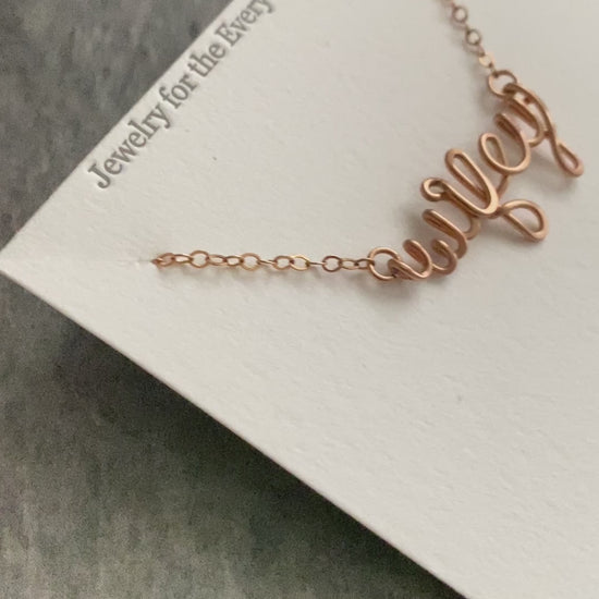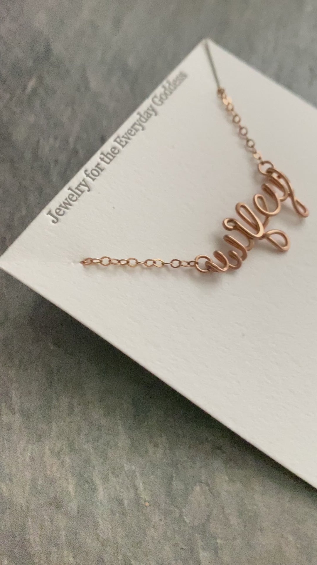 Hand formed from 14k rose gold filled wire and 14k rose gold filled chain with spring ring clasp, the word portion measures about 1 inch wide depending on how many letters it is. The length you select will include the word “wifey” and chain.